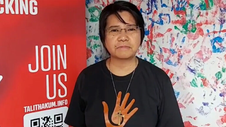 Enquanto rezam, contemplam a imagem de Nossa Senhora Aparecida.