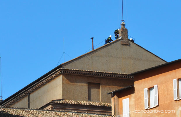 Às 7h no Brasil (11h em Roma) foi colocada a chaminé sobre o teto da Capela Sistina