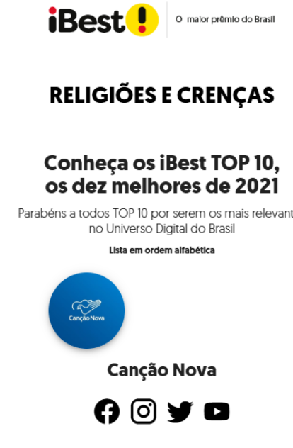 Canção Nova foi premiada com o Prêmio iBest.Considerada como a maior premiação da internet no Brasil - conquistando posição no Top 3 e no Top 10 na categoria "Religiões e Crenças". O reconhecimento se deve à sua relevância e popularidade no ambiente digital