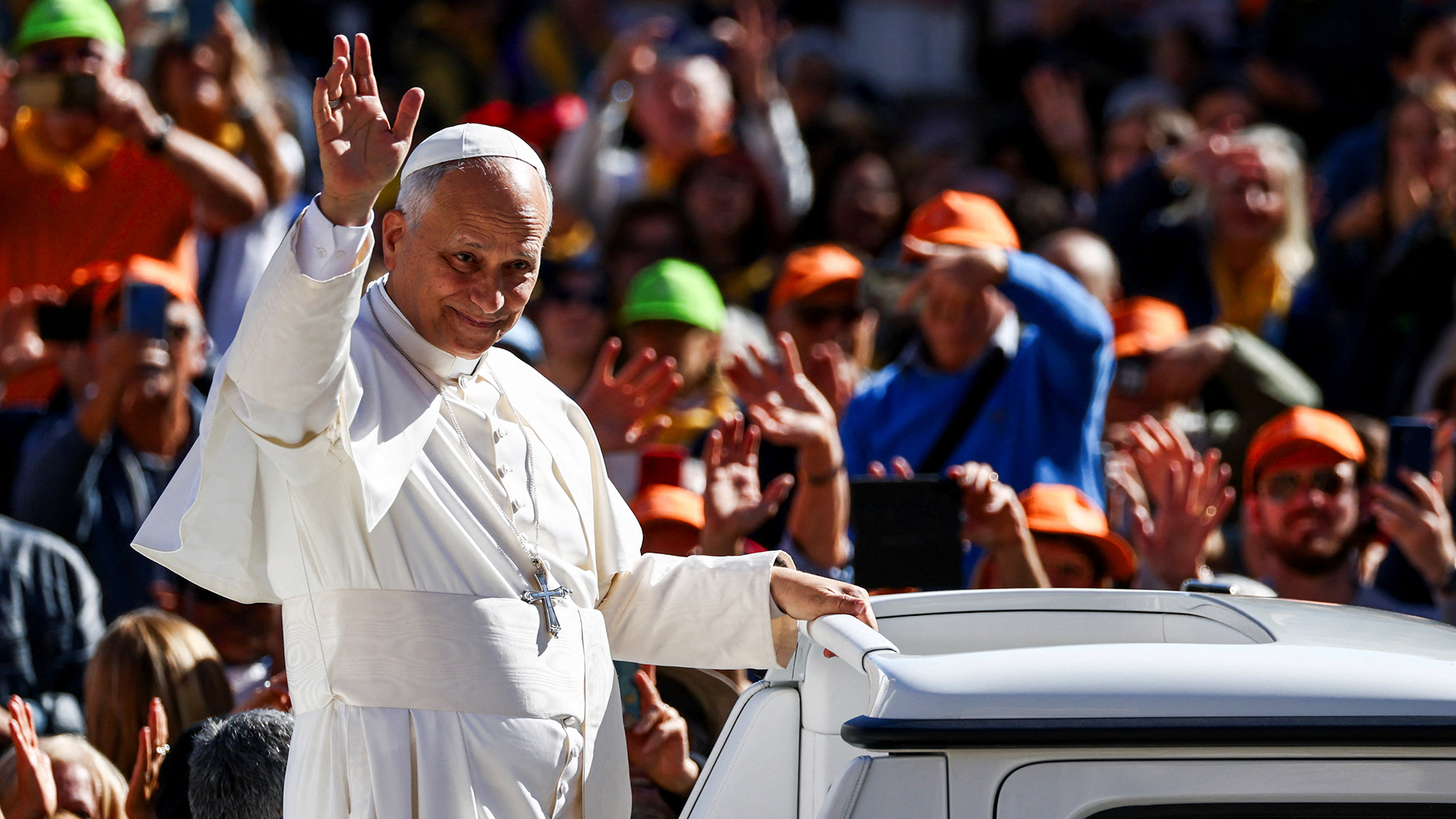 Leão XIV gesticula do Papamóvel, ao chegar para saudar os peregrinos das Dioceses da Toscana / Foto: Matteo Minnella – Reuters