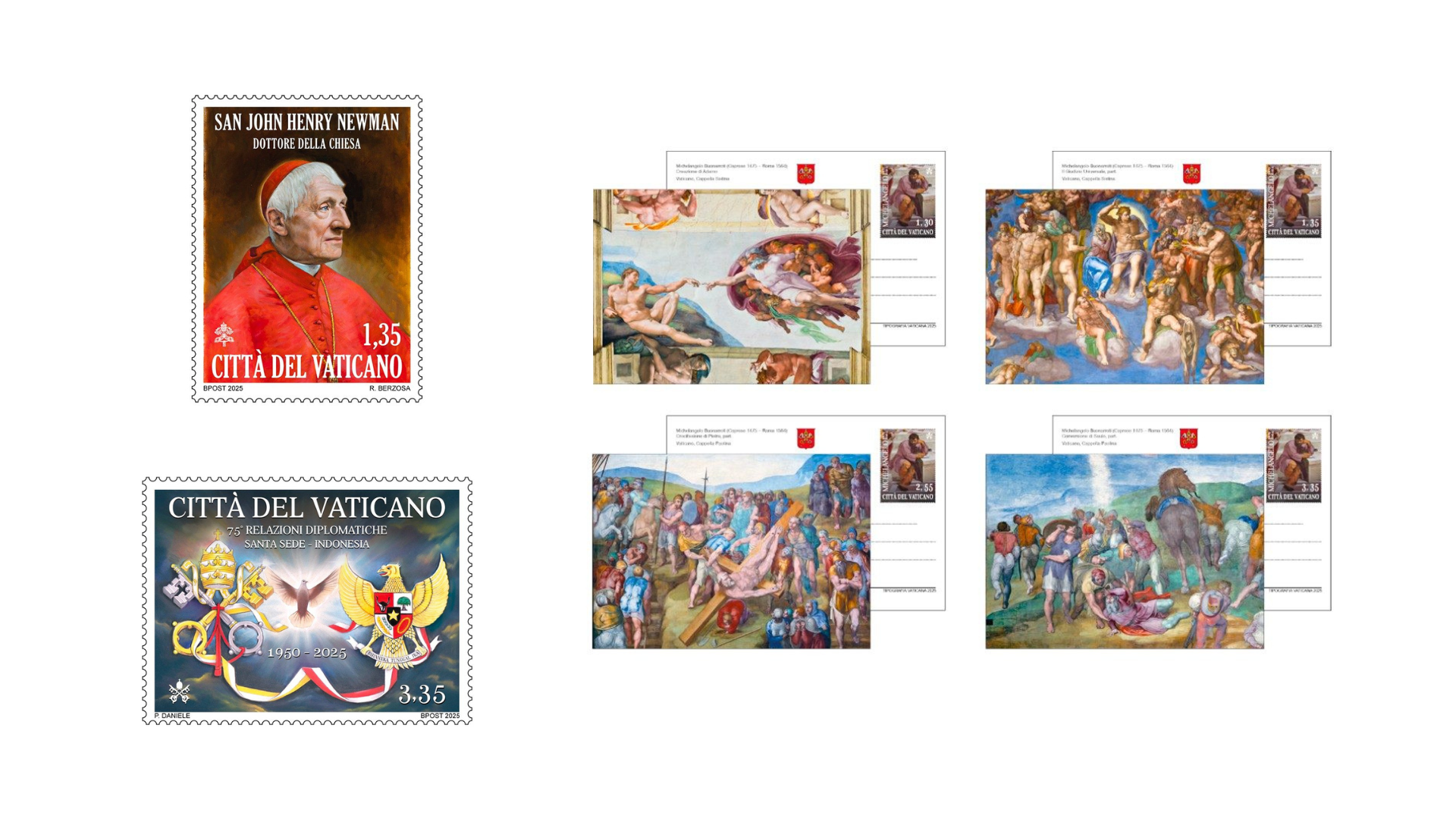 Também foram lançados selos com outros temas: o Natal do Senhor, cuja celebração se aproxima; São João Henrique Newman, proclamado Doutor da Igreja pelo Papa Leão XIV no dia 1º deste mês; Santa Teresinha do Menino Jesus, cuja canonização completou 100 anos; Santa Kateri Tekakwitha, primeira santa nativa americana e homenageada na série filatética “Testemunhos de Esperança”; o 75º aniversário das relações diplomáticas entre a Santa Sé e a Indonésia; e o 550º aniversário do nascimento de Michelangelo.