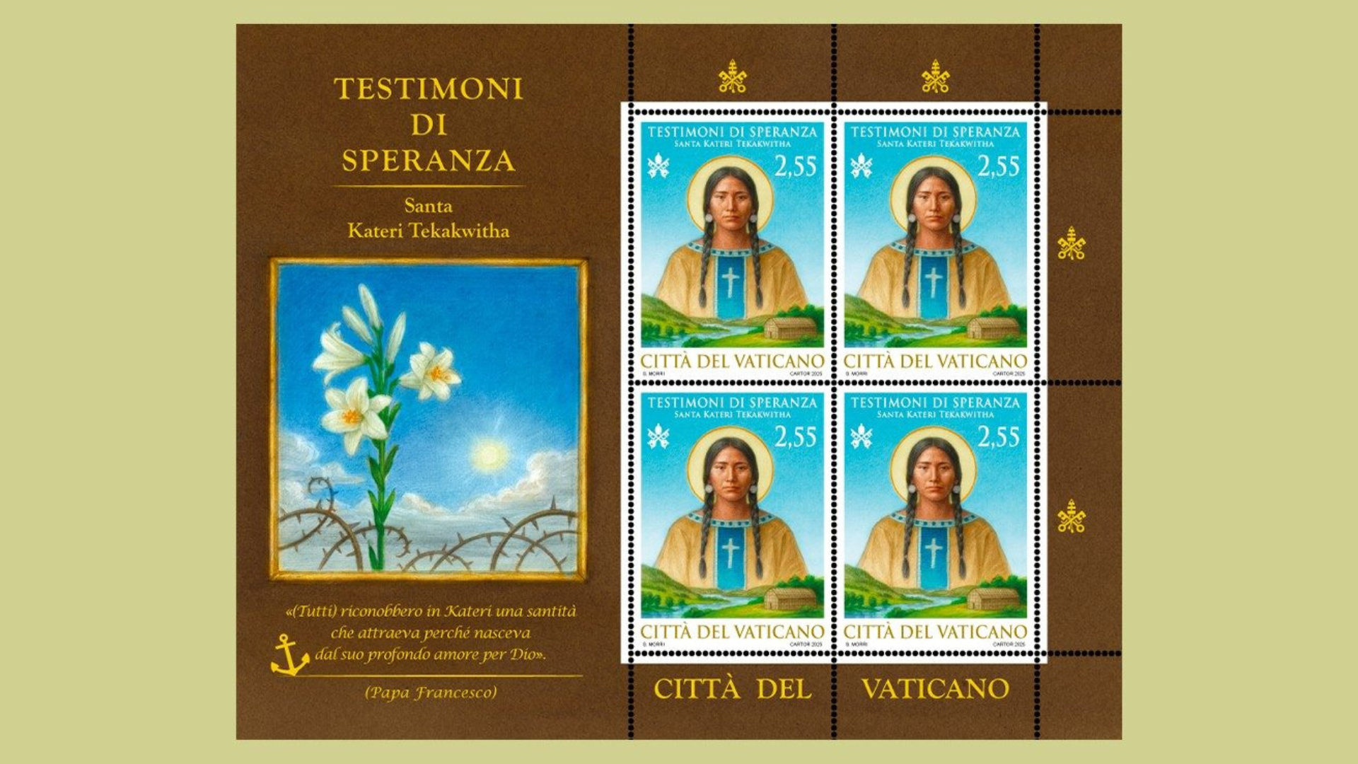Folheto com selos da série “Testemunhos de Esperança” em homenagem a Santa Kateri Tekakwitha / Foto: Reprodução Vatican News
