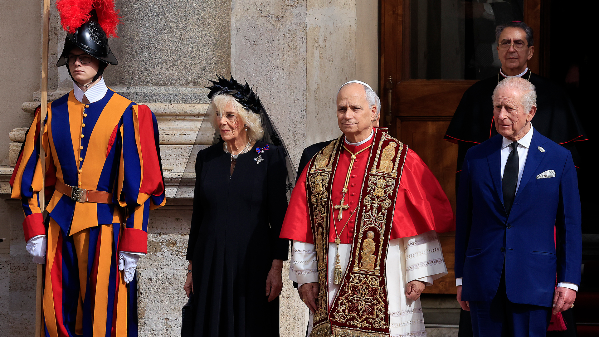 Rei Charles III e a Rainha Camilla no final do encontro com o Papa Leão XIV, seguido de uma celebração ecumênica na Capela Sistina, no Vaticano / Foto: Anadolu via Reuters Connect