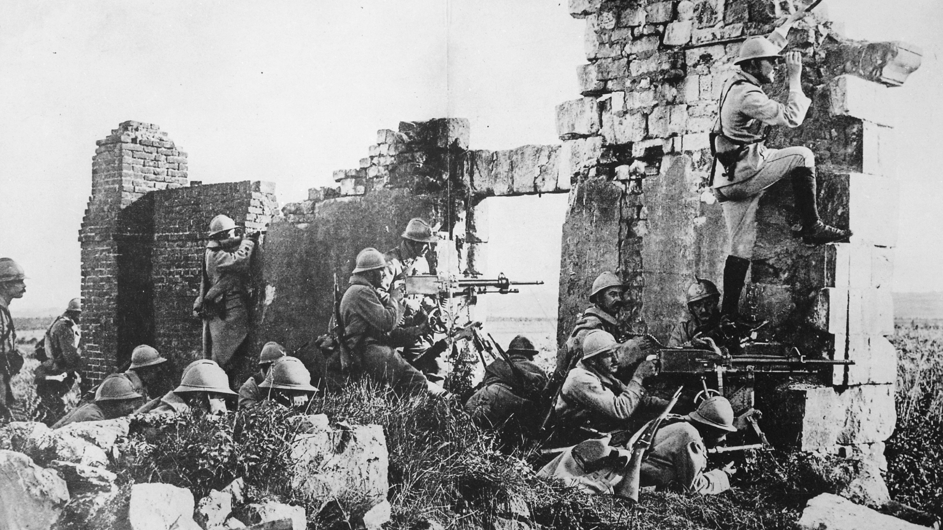 Soldados franceses entre as ruínas de uma catedral para combater tropa alemã, 1918
