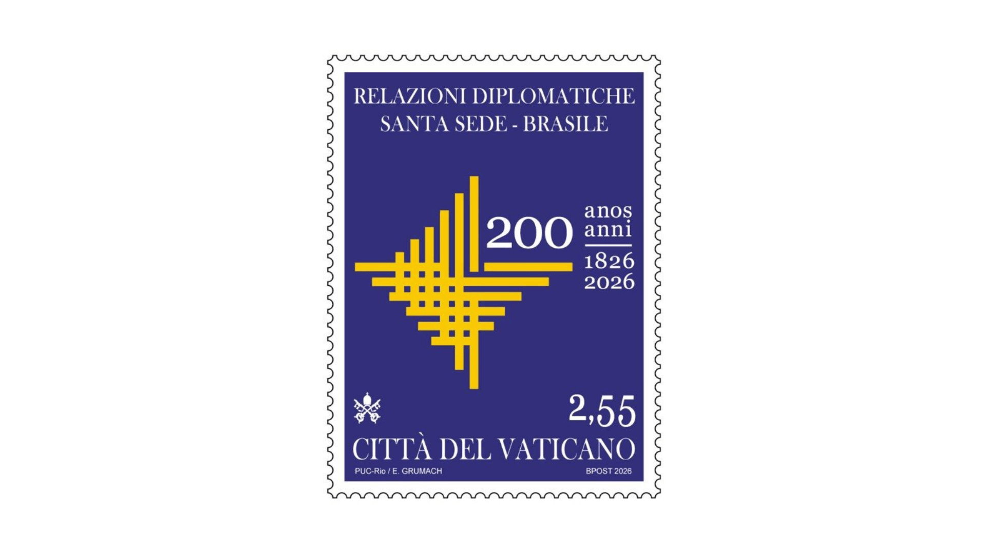 Em emissão desde 26 de fevereiro, selo custa 2,55 € e integra série de comemorações do bicentenário dos laços diplomáticos entre o Brasil e a Santa Sé
