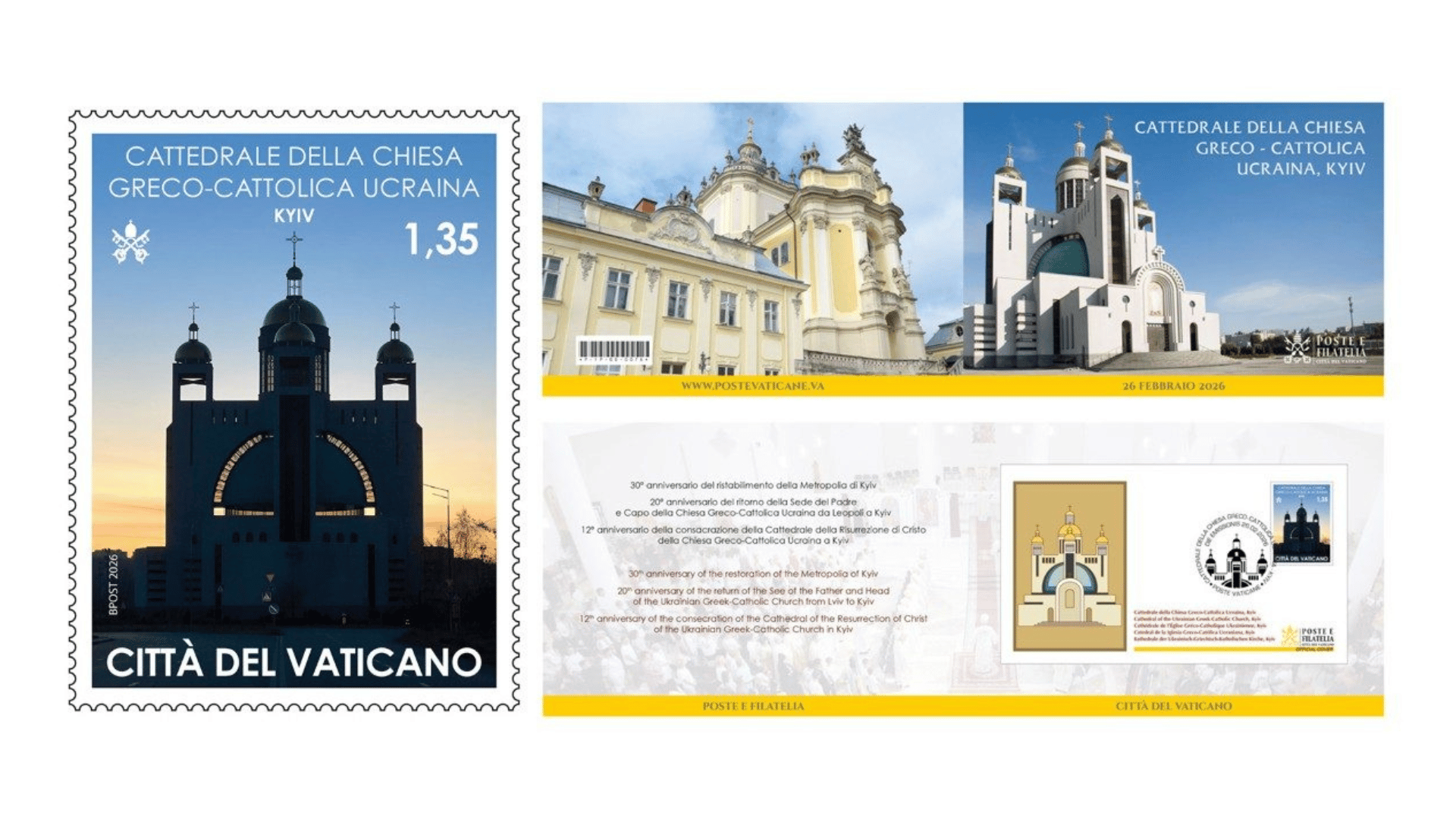 Por fim, para comemorar um triplo aniversário dedicado à Igreja Greco-Católica na Ucrânia, os Correios do Vaticano estão emitindo um folder com envelope comemorativo em tiragem limitada, um selo e um carimbo postal especial die emissionis, dedicados à Catedral de Kiev. O produto inclui um folder ao preço de 10 € com um envelope comemorativo, ilustrado com a imagem da Catedral da Ressurreição de Cristo, selado com um selo de 1,35 €.