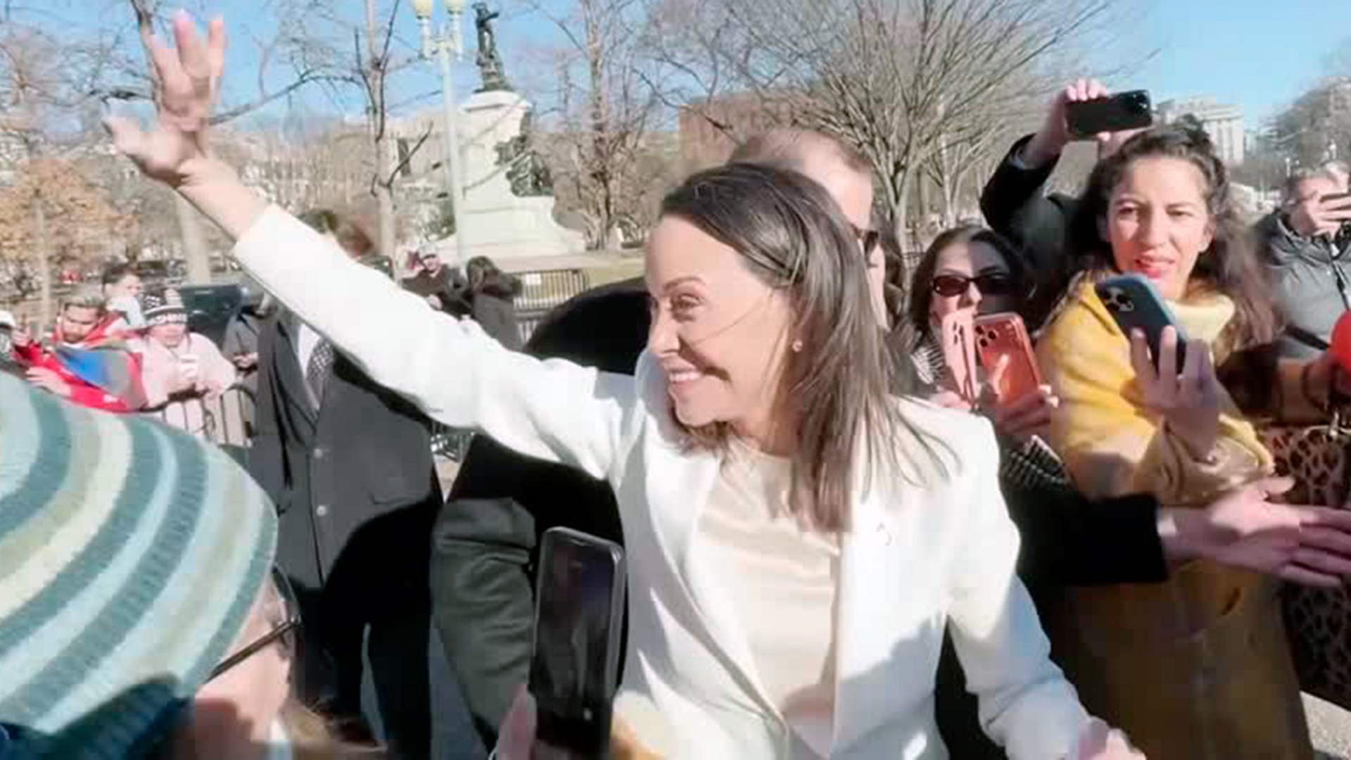 Maria Corina Machado acena ao deixar a Casa Branca, nesta sexta-feira, 16 / Foto: Reprodução Reuters