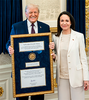 Um dos possíveis tópicos de conversa para a reunião desta quinta-feira na Casa Branca foi o Prêmio Nobel da Paz, concedido a Corina no mês passado, uma afronta a Trump, que há muito almejava a premiação. A venezuelana havia sugerido que entregaria o prêmio ao presidente estadunidense por ter deposto o ex-líder Nicolás Maduro, embora o Instituto Nobel da Noruega tenha afirmado que o prêmio não pode ser transferido, compartilhado ou revogado. Ao sair da reunião com Trump, Machado se recusou a dizer se havia entregado o prêmio ao presidente.