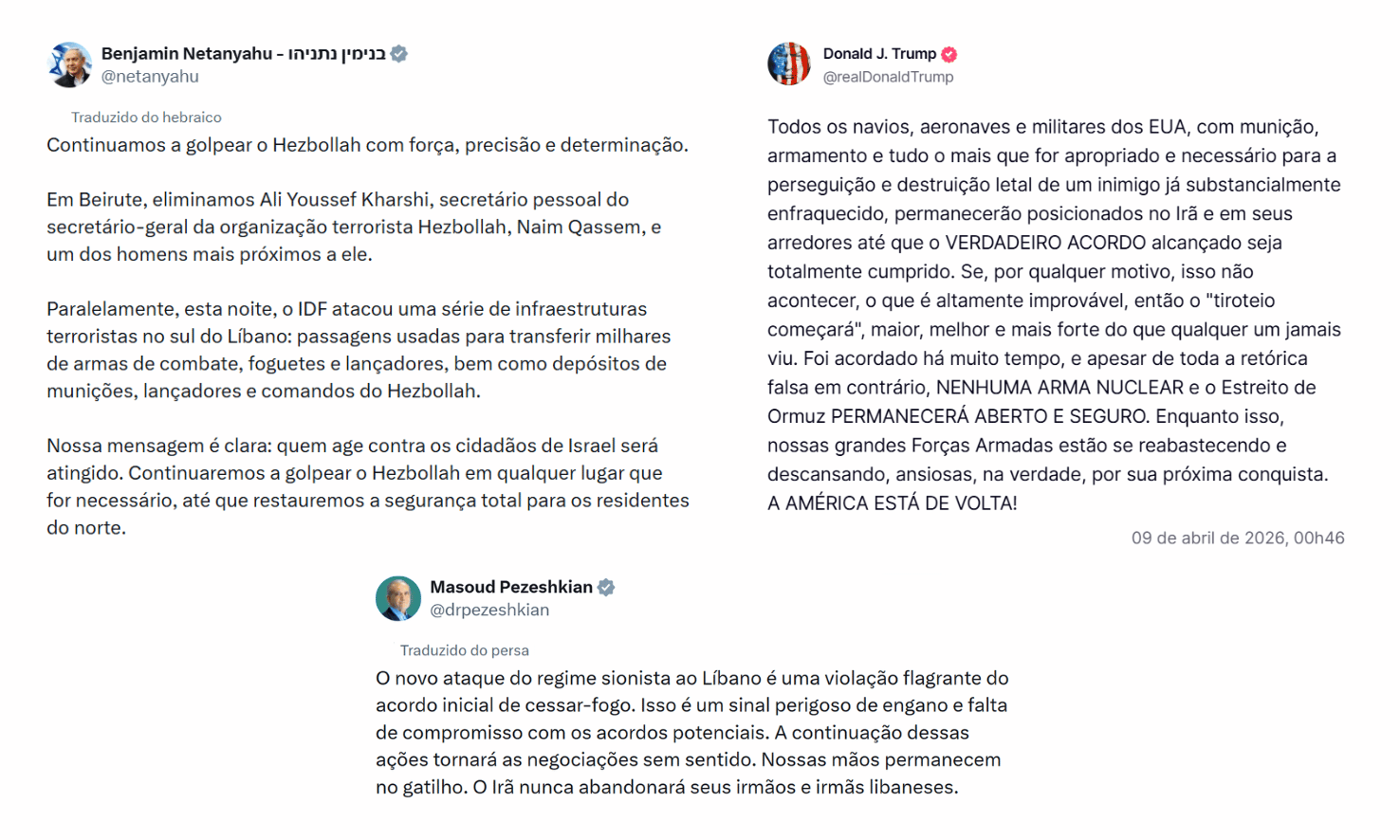 Por sua vez, o presidente do Irã, Masoud Pezeshkian, declarou que os ataques israelenses ao Líbano são uma violação flagrante do acordo inicial de cessar-fogo. “Isso é um sinal perigoso de engano e falta de compromisso com os acordos potenciais. A continuação dessas ações tornará as negociações sem sentido. Nossas mãos permanecem no gatilho. O Irã nunca abandonará seus irmãos e irmãs libaneses”, afirmou.