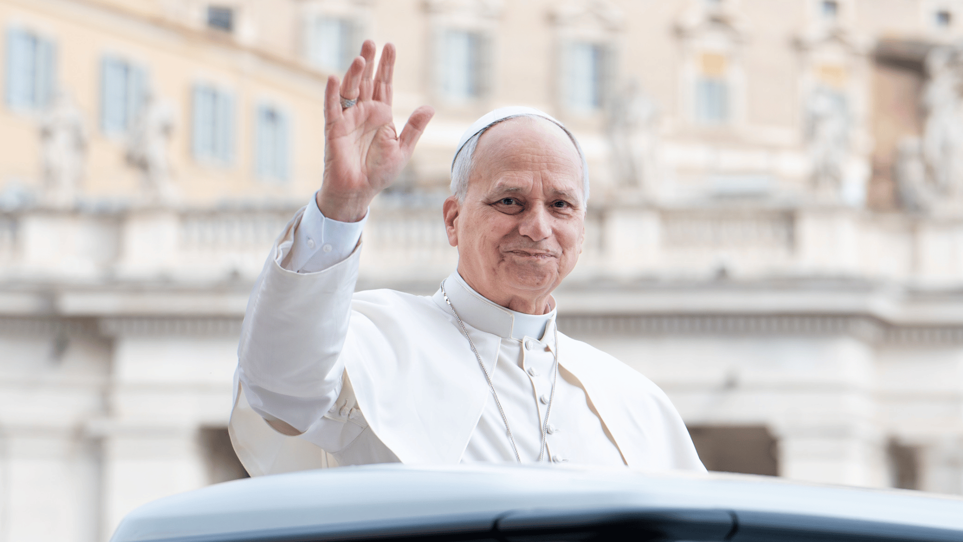 A imagem ilustra o Papa Leão XIV, com suas habituais vestes pontifícias, com o braço direito erguido em gesto de aceno.
